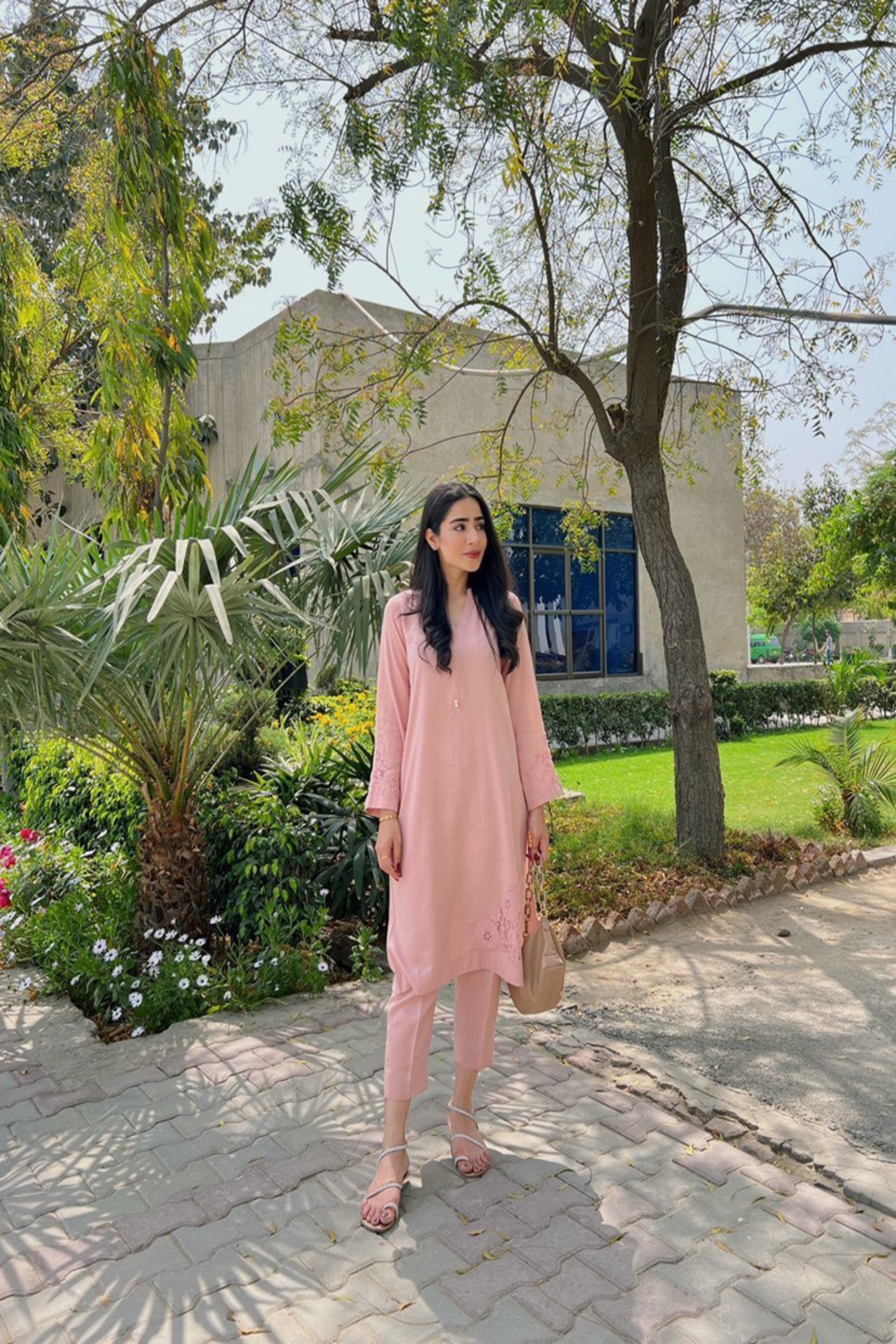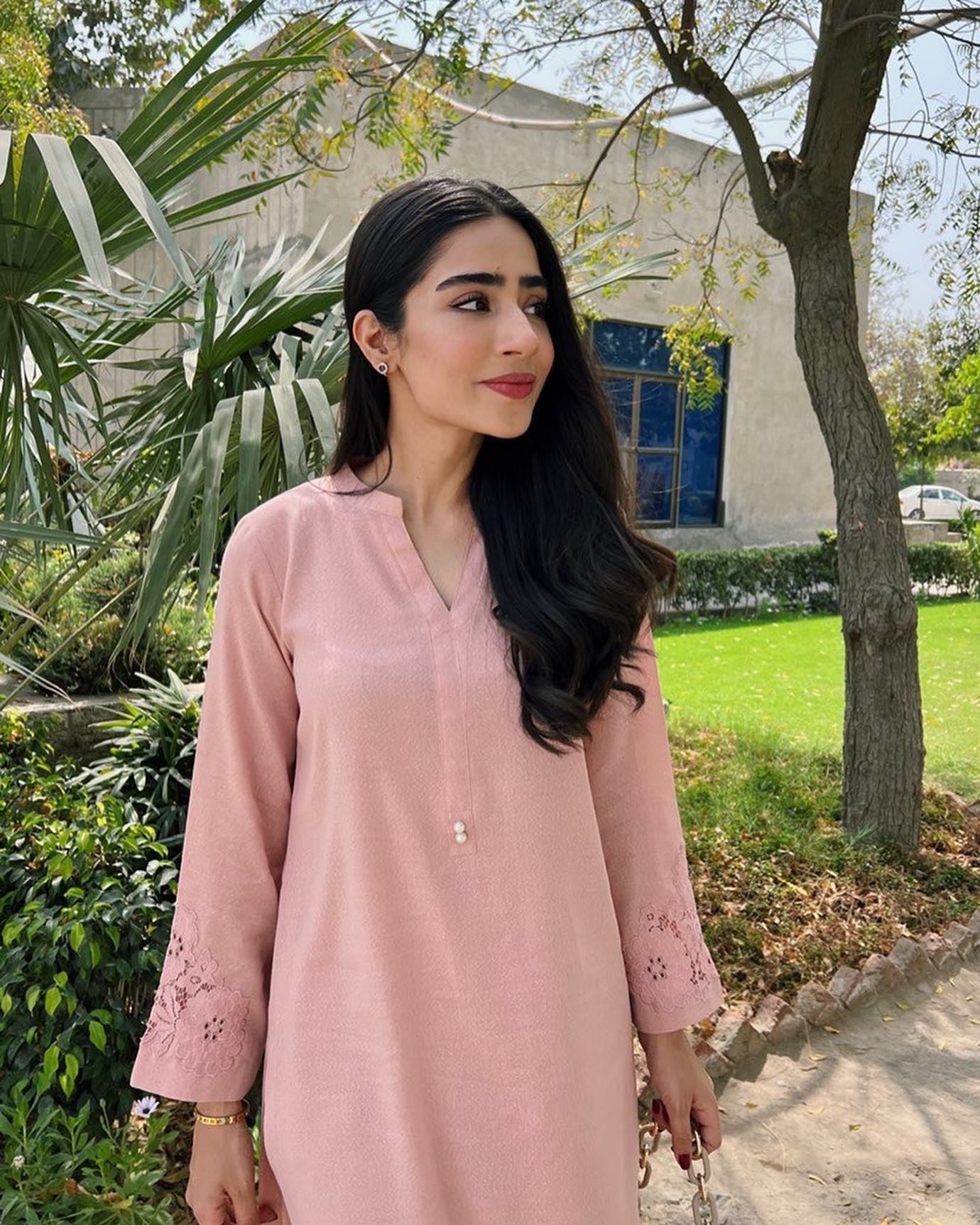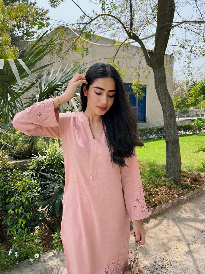 This blush pink outfit is a beautiful and unique addition to any wardrobe. The top features a gorgeous floral organza, which has been delicately appliquéd onto the front corner and sleeves. The pattern is intricate and detailed, creating a stunning and eye-catching design.