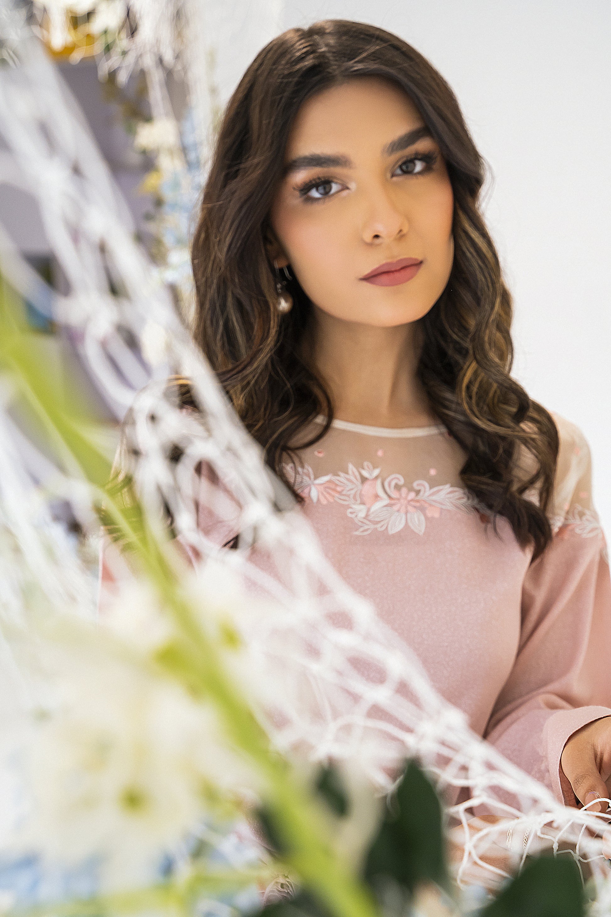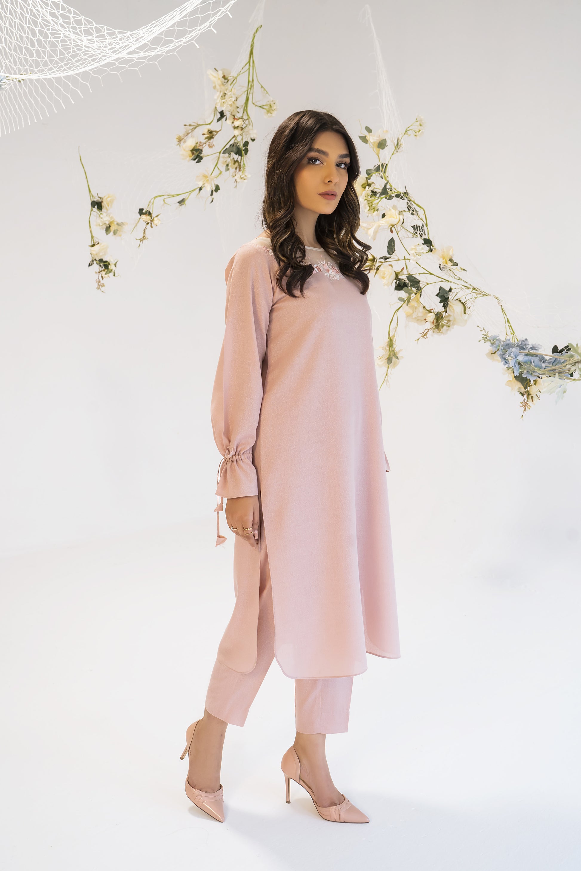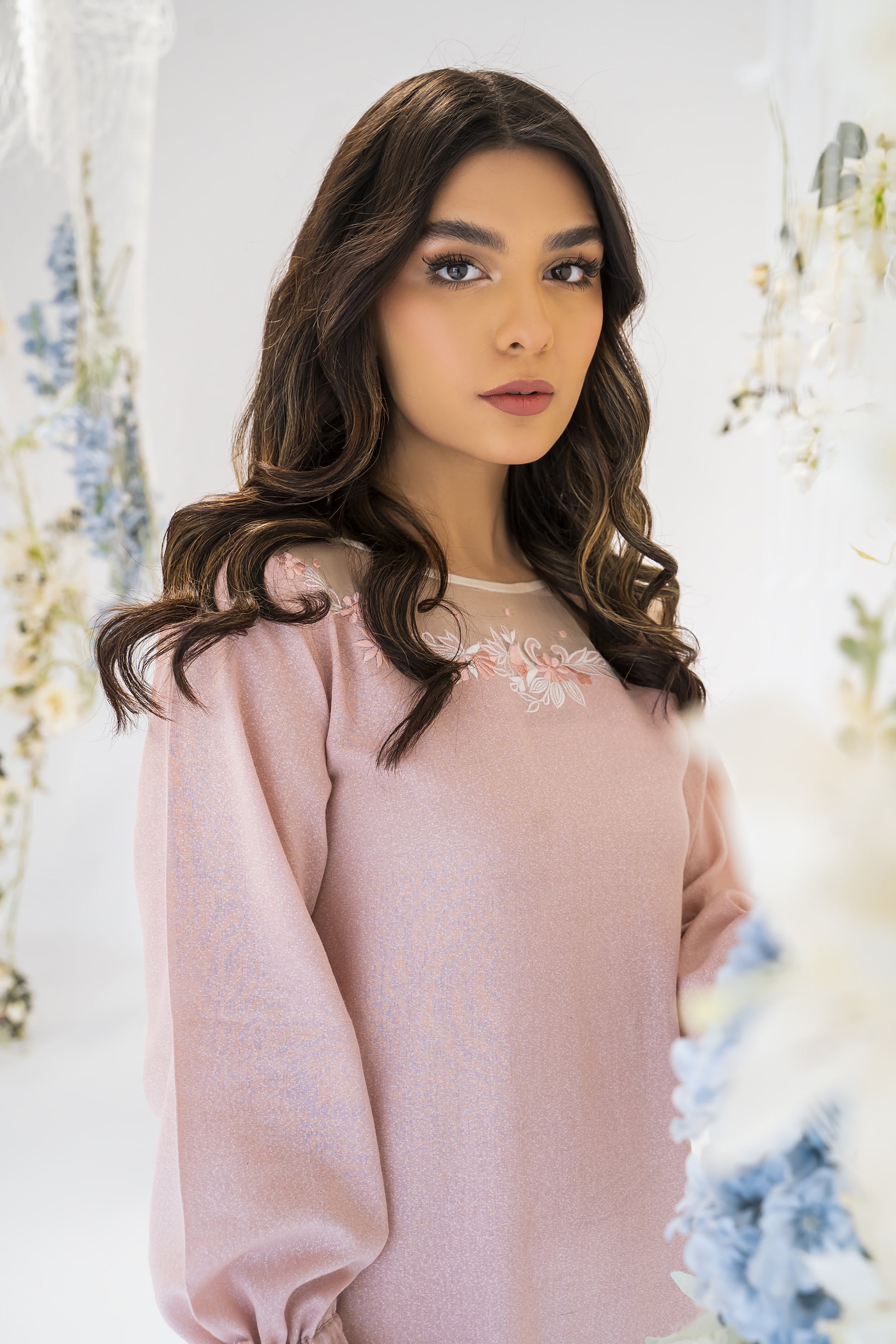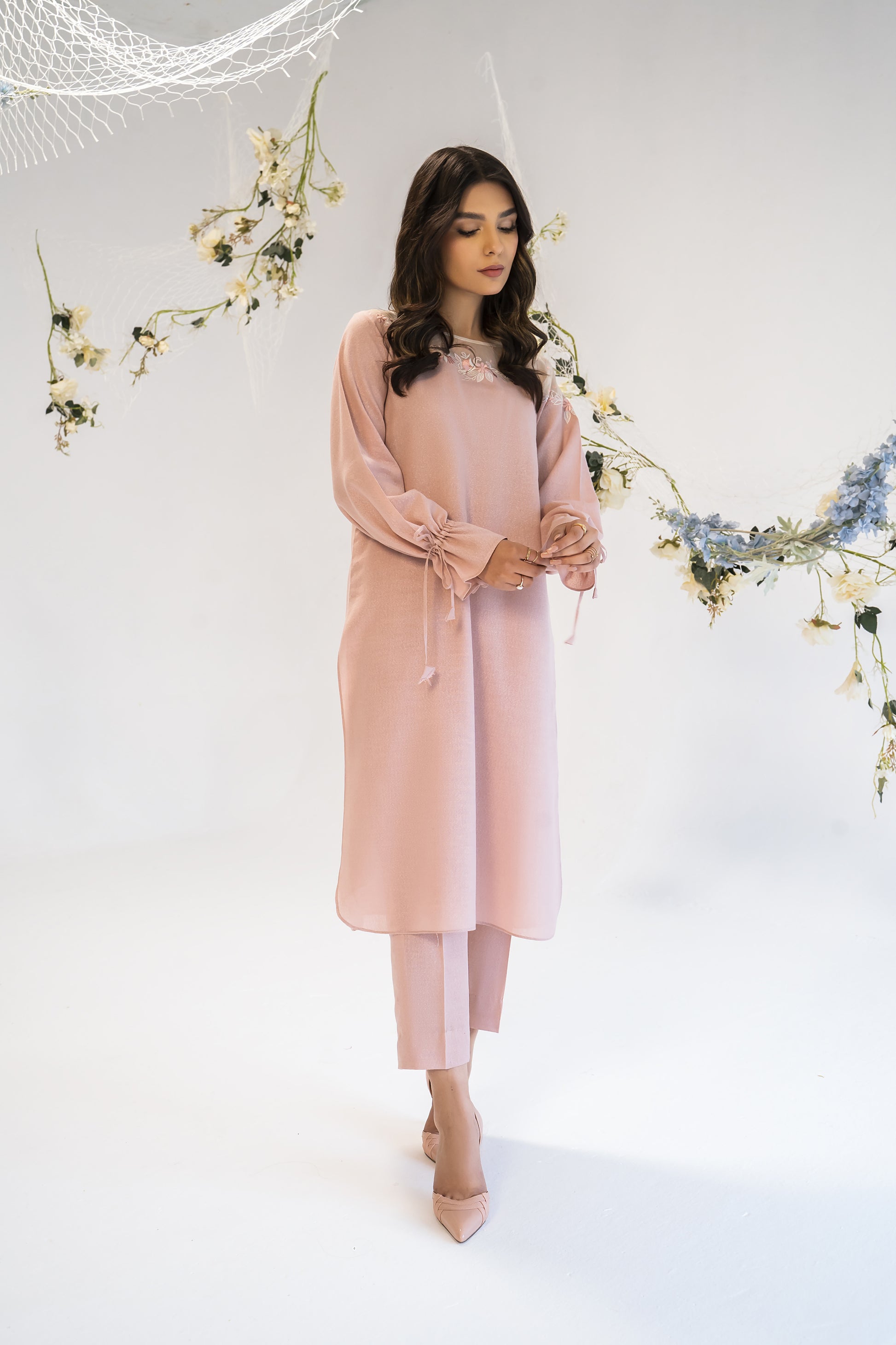 This blush pink outfit is made from summer fabric that's comfortable to wear. Its soothing color is complemented by organza detailing along the neckline of the shirt and frill sleeves, adding an extra touch of elegance to the design.