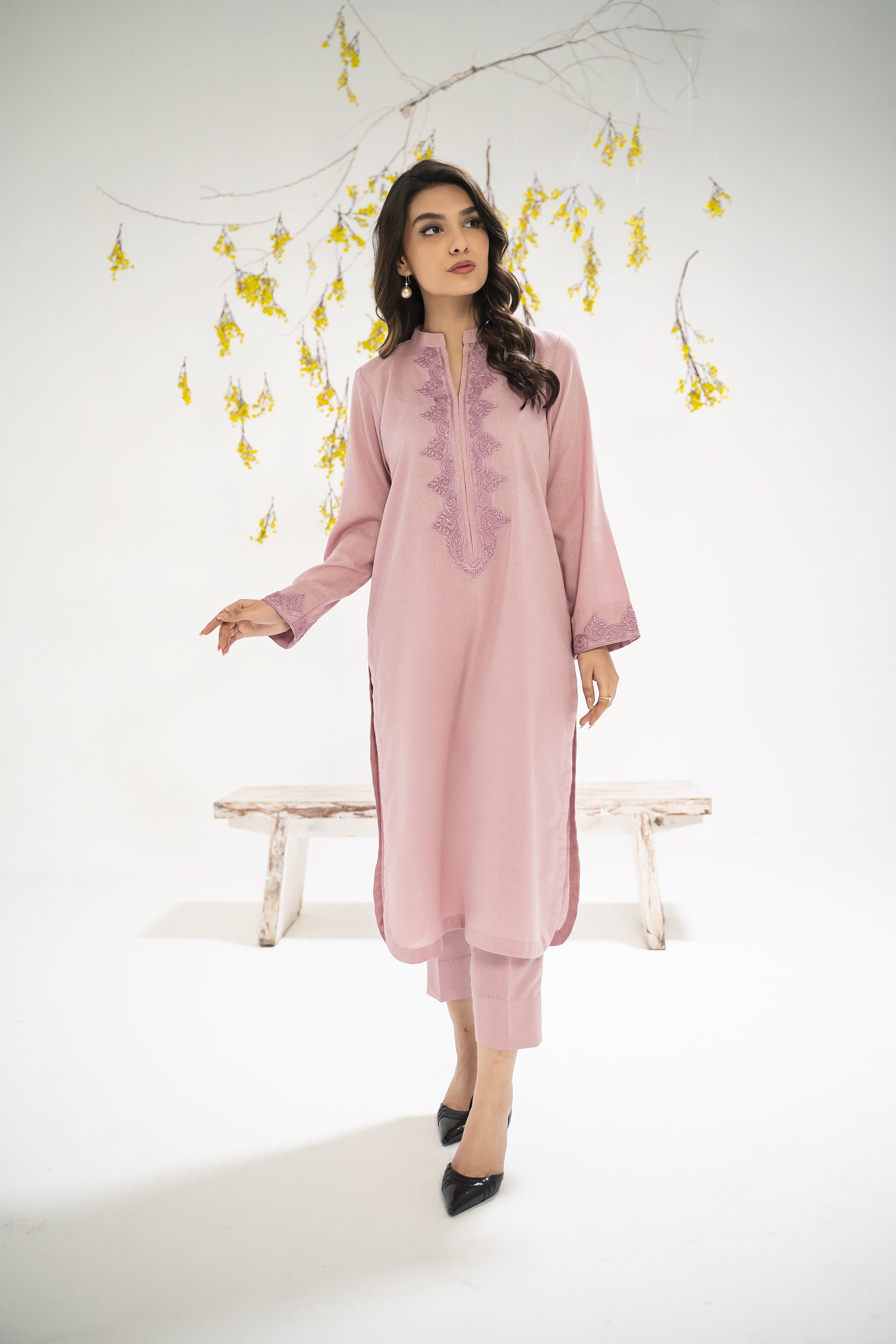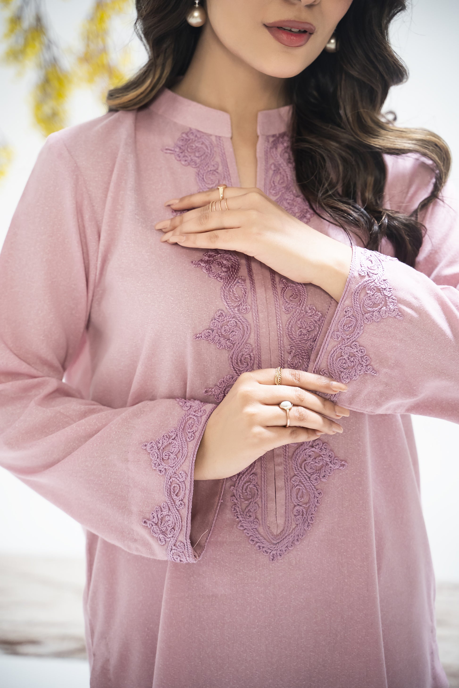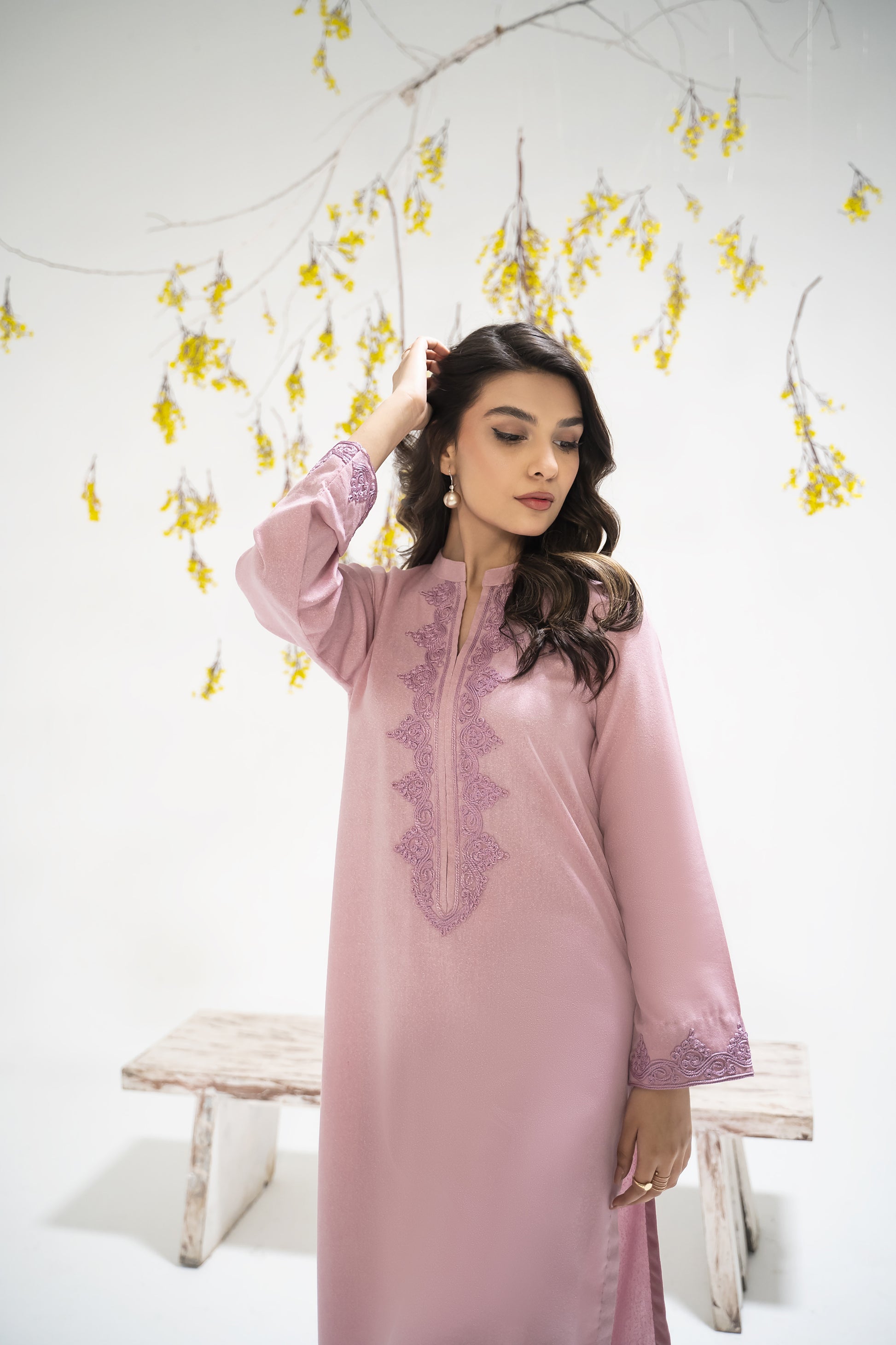 This summer-friendly lavender outfit is made from flowy fabric that's comfortable to wear. Its soothing color is complemented by 3D embroidered detailing on neckline and sleeves, adding an extra touch of elegance to the design.