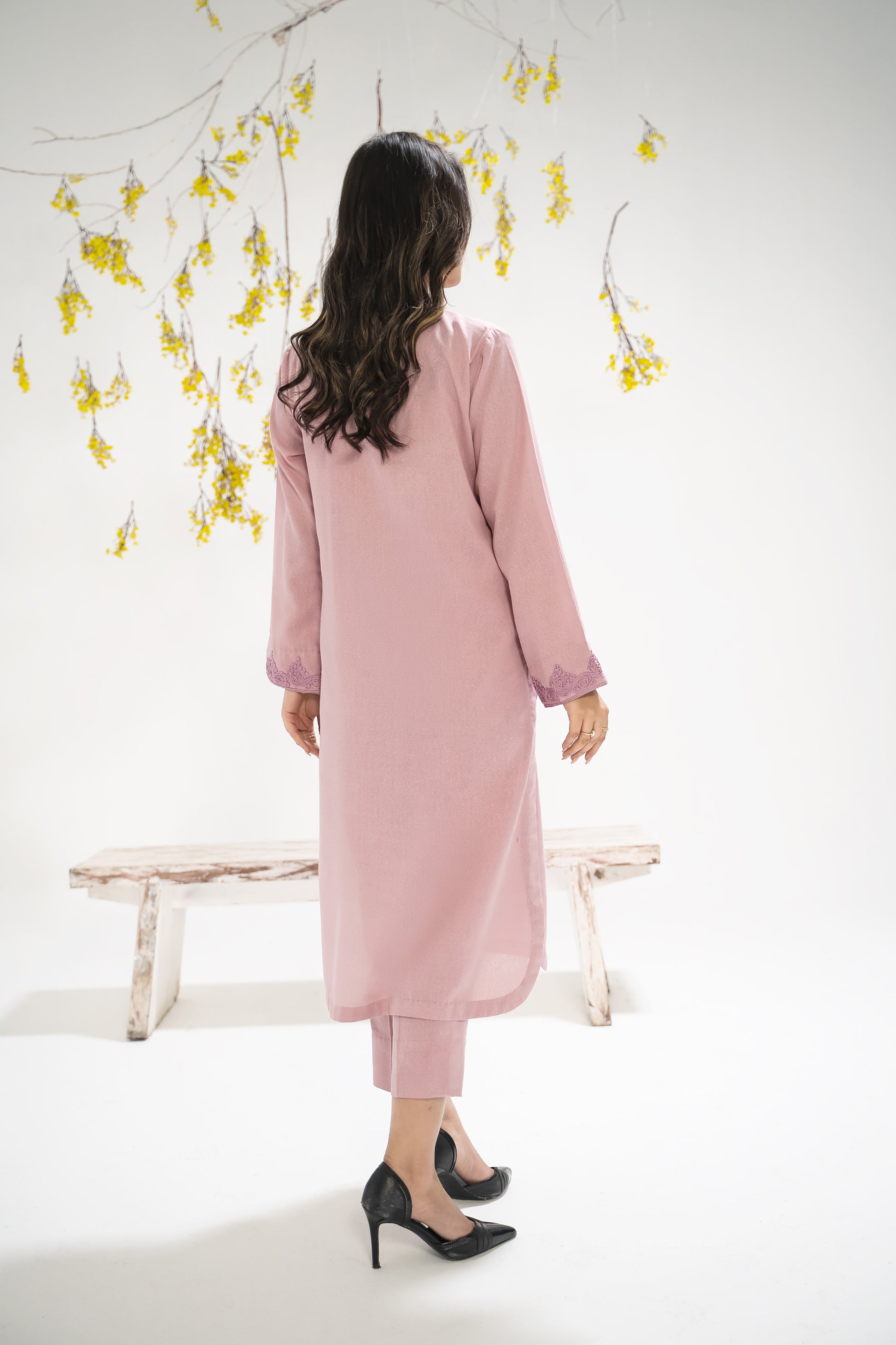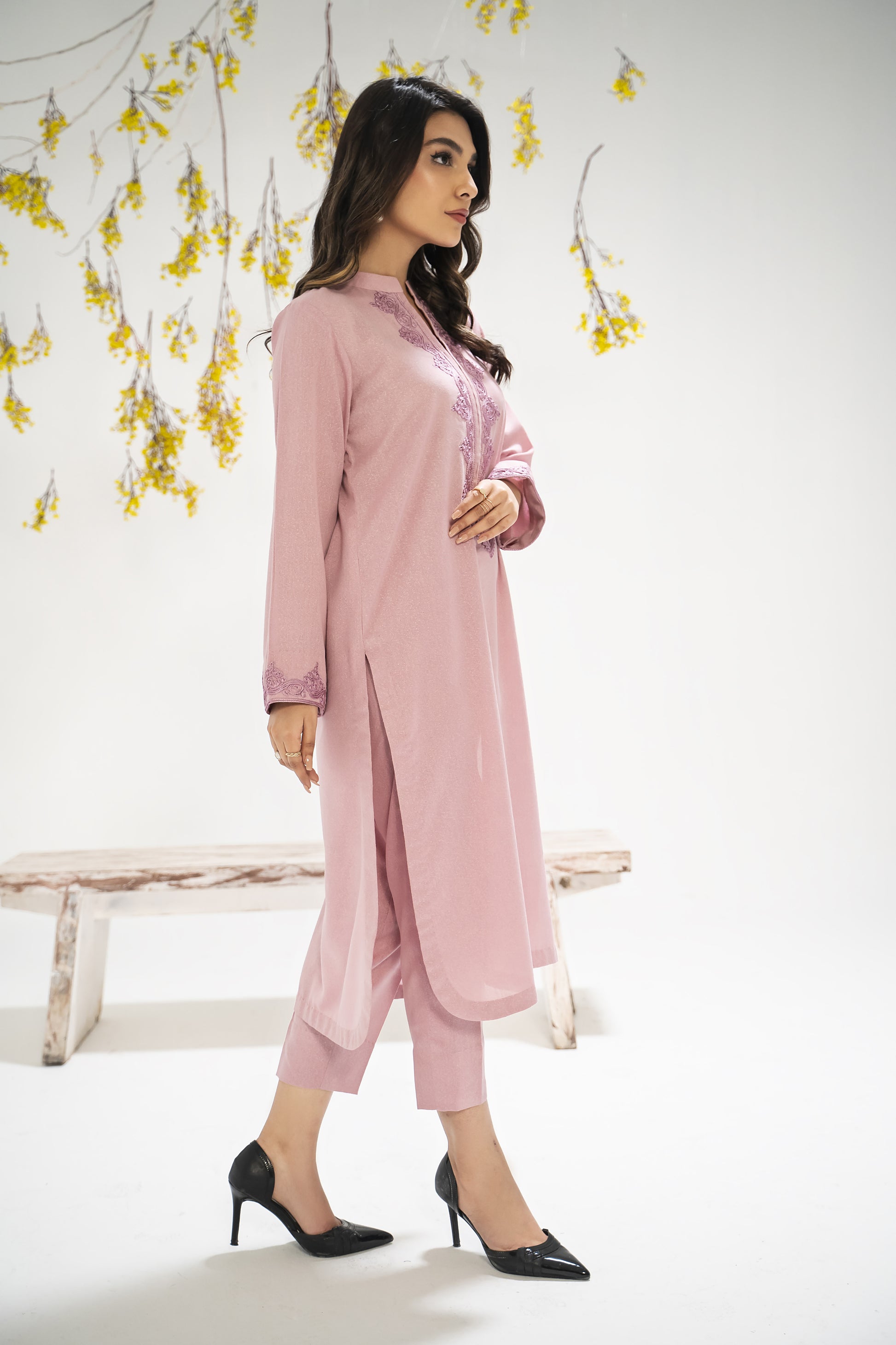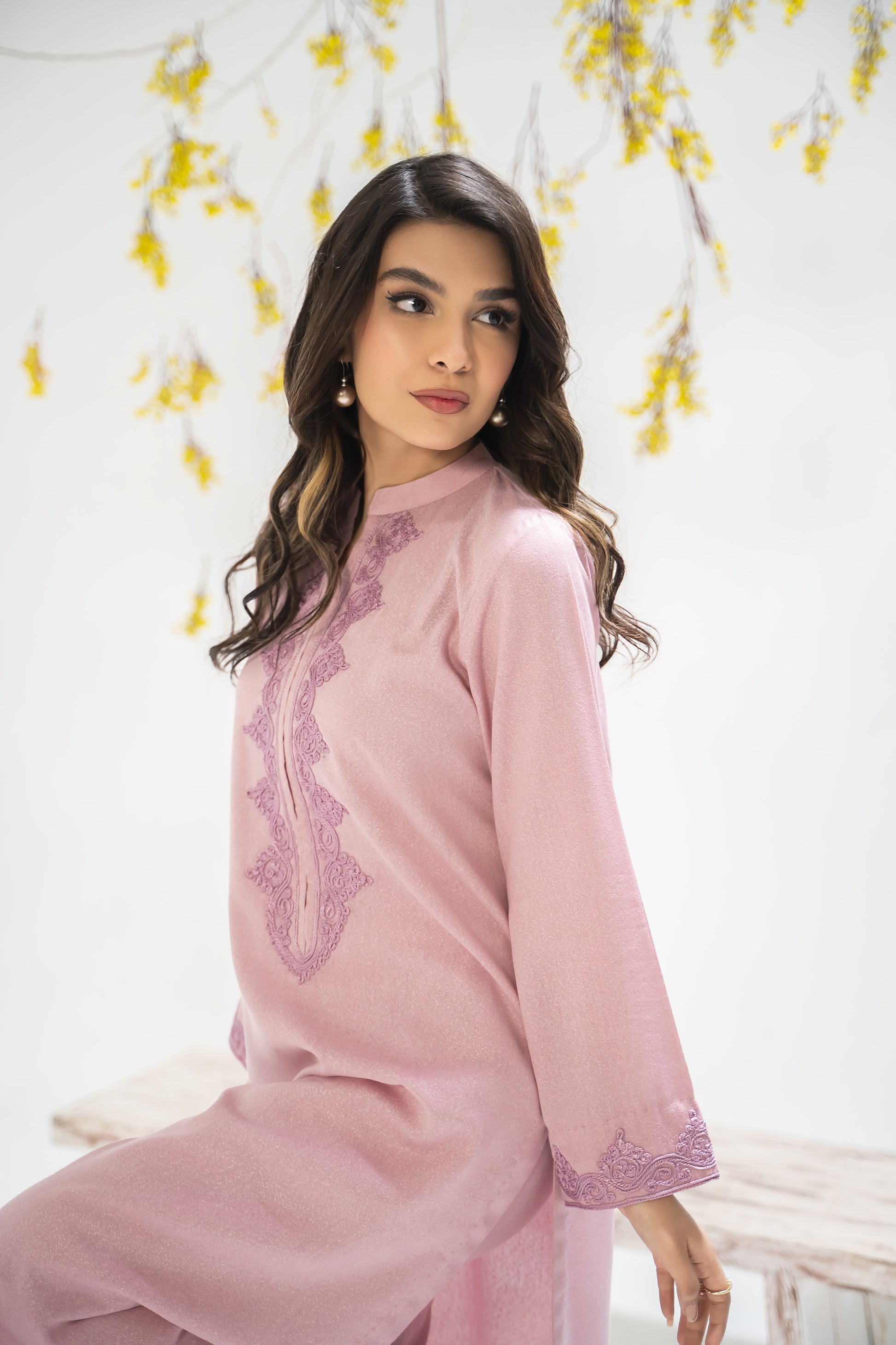 This summer-friendly lavender outfit is made from flowy fabric that's comfortable to wear. Its soothing color is complemented by 3D embroidered detailing on neckline and sleeves, adding an extra touch of elegance to the design.