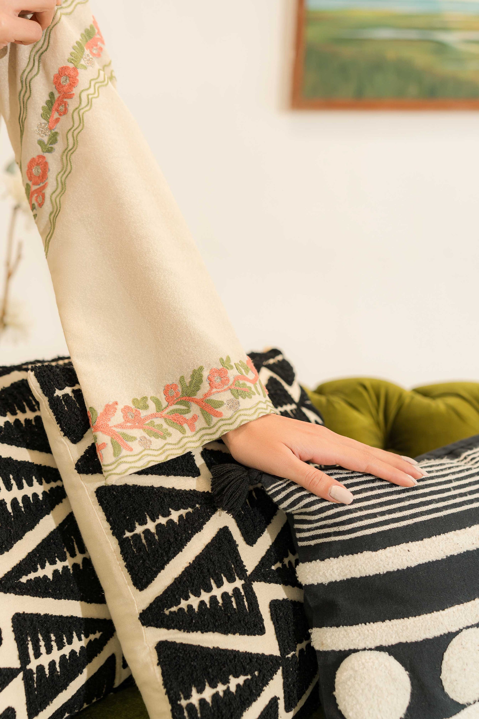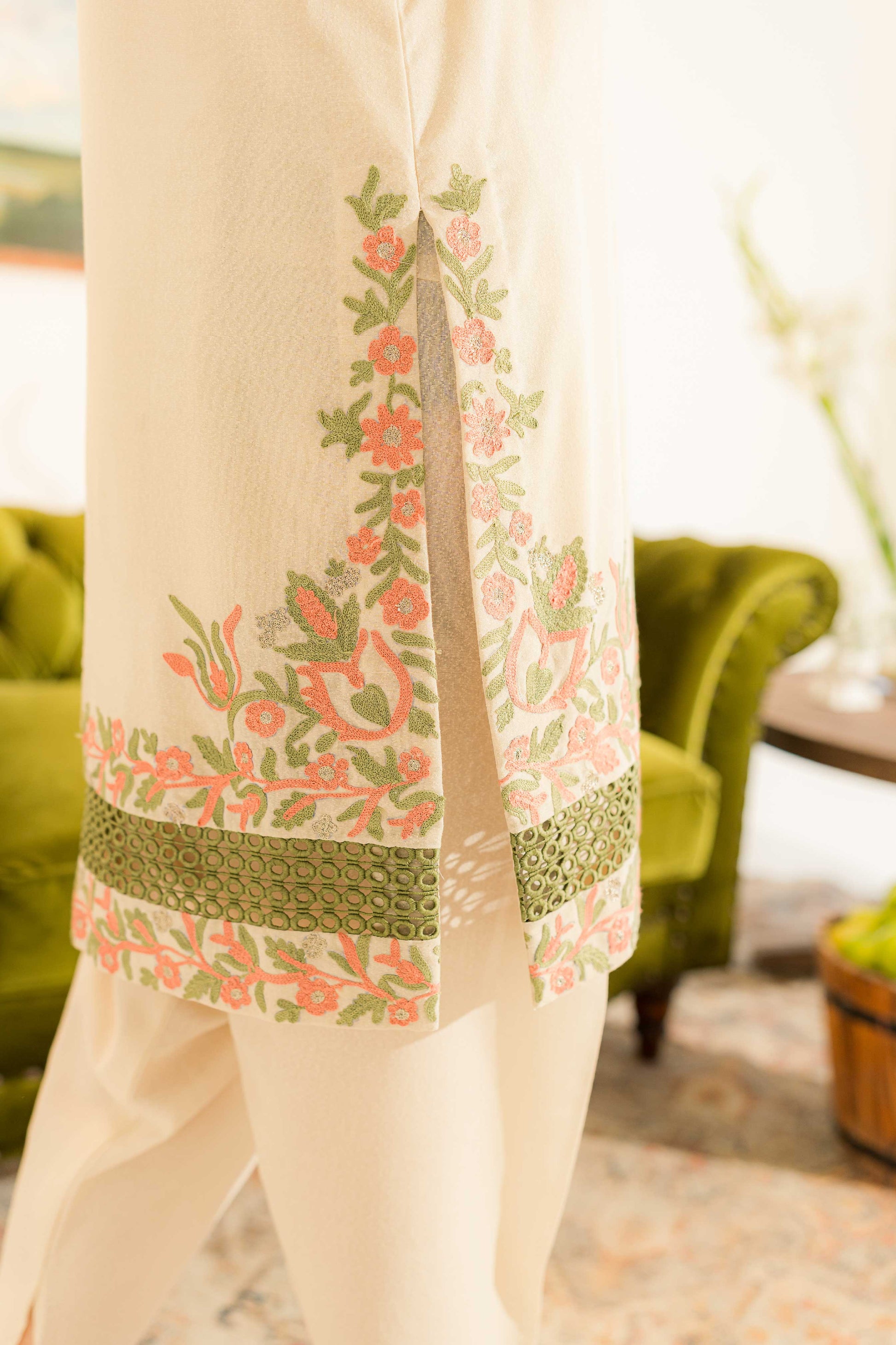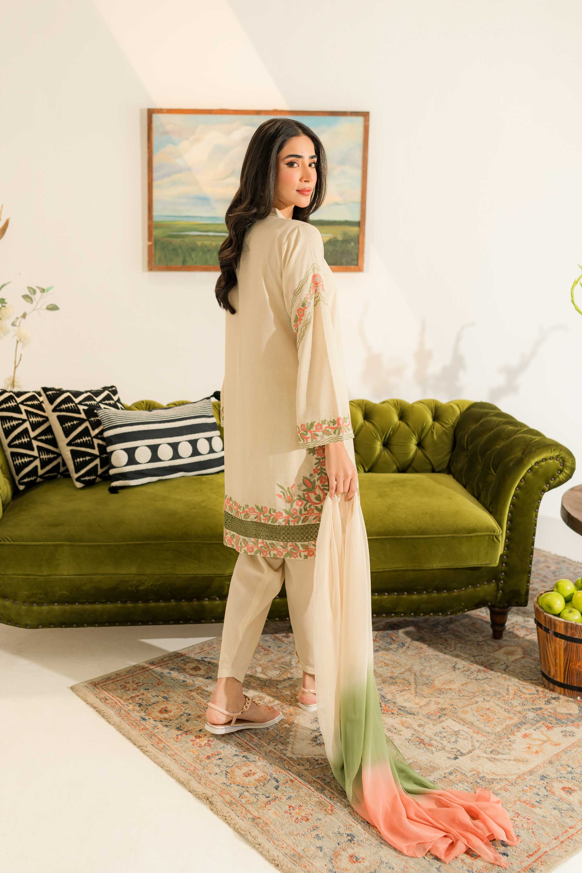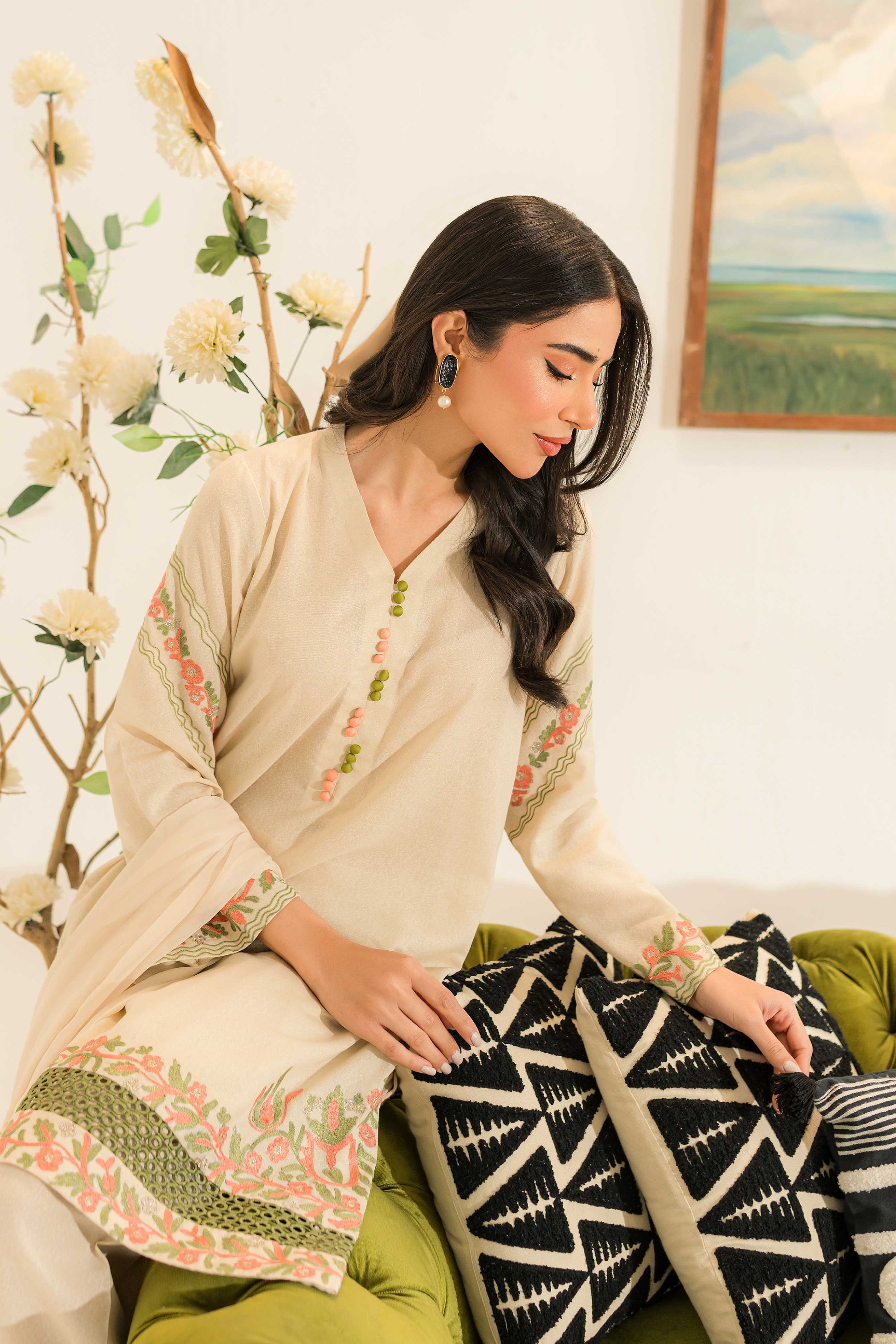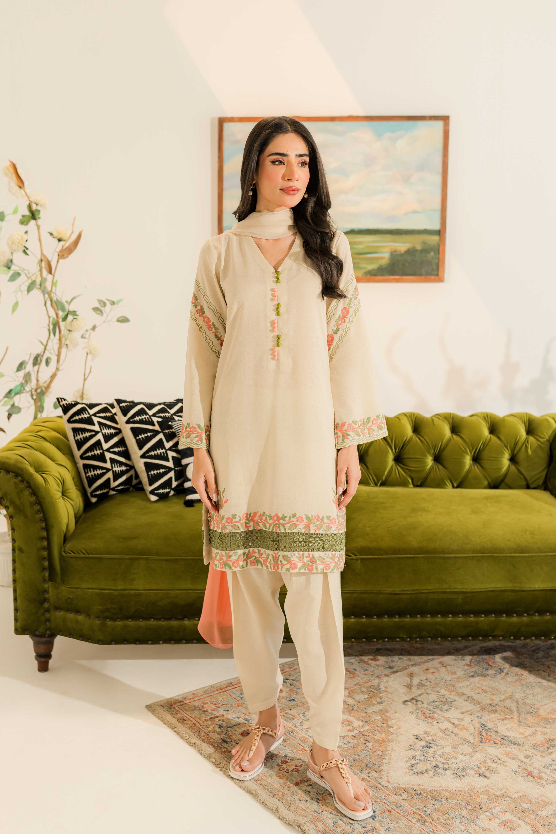 Our off-white ensemble features a short shirt paired with a skinny shalwar. Adorned with vibrant orange and green embroidery, along with delicate hints of gold and lace detailing, it radiates elegance and charm, perfect for any occasion.