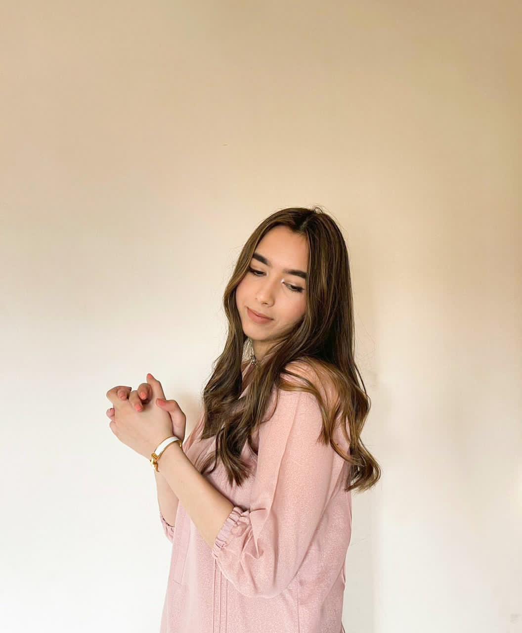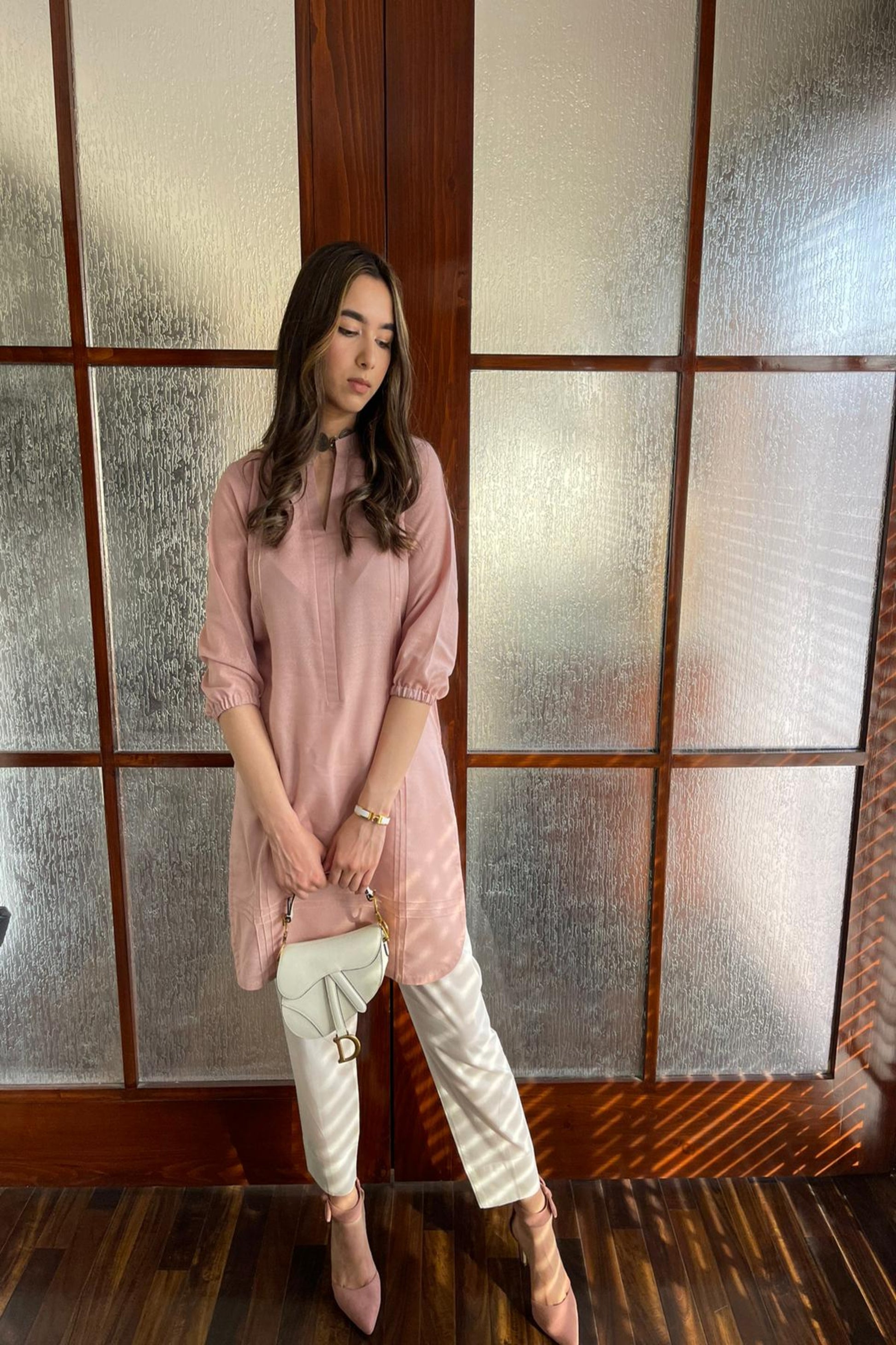 This outfit in a powder pink hue features a unique asymmetrical design, along with pleated details and a round hem for added sophistication