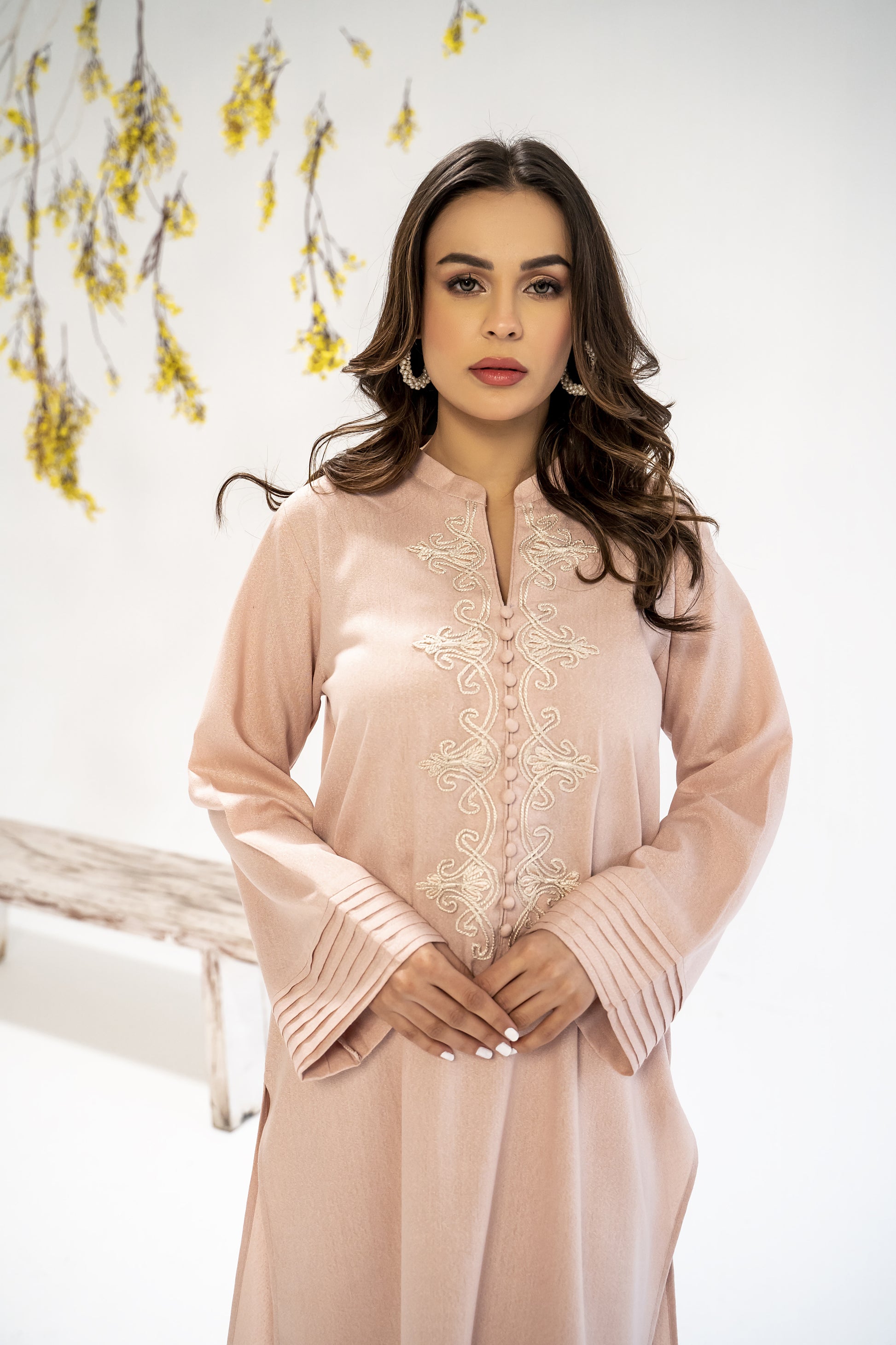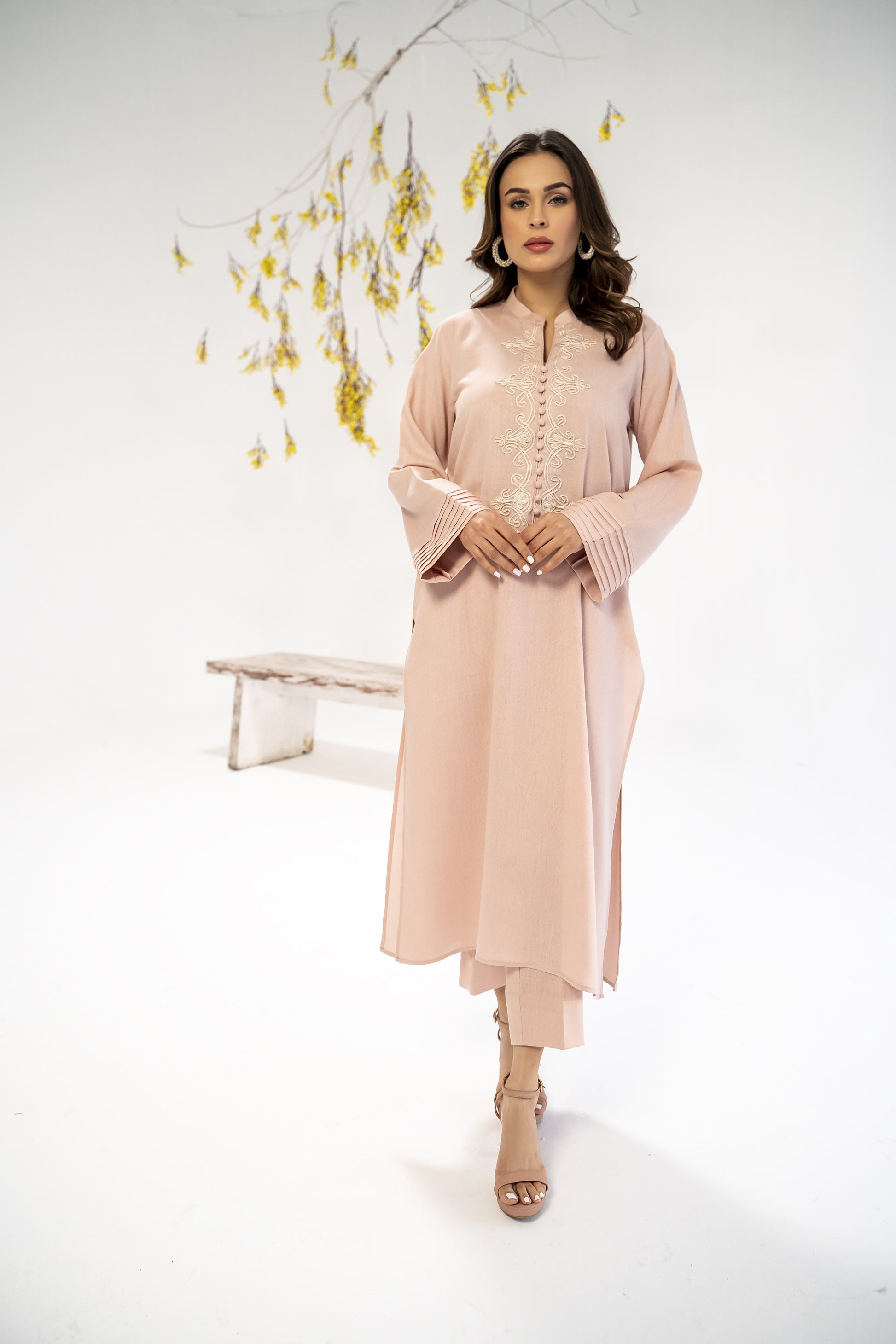 A blush pink outfit with 3D embroidery details along the neckline and button detailing.