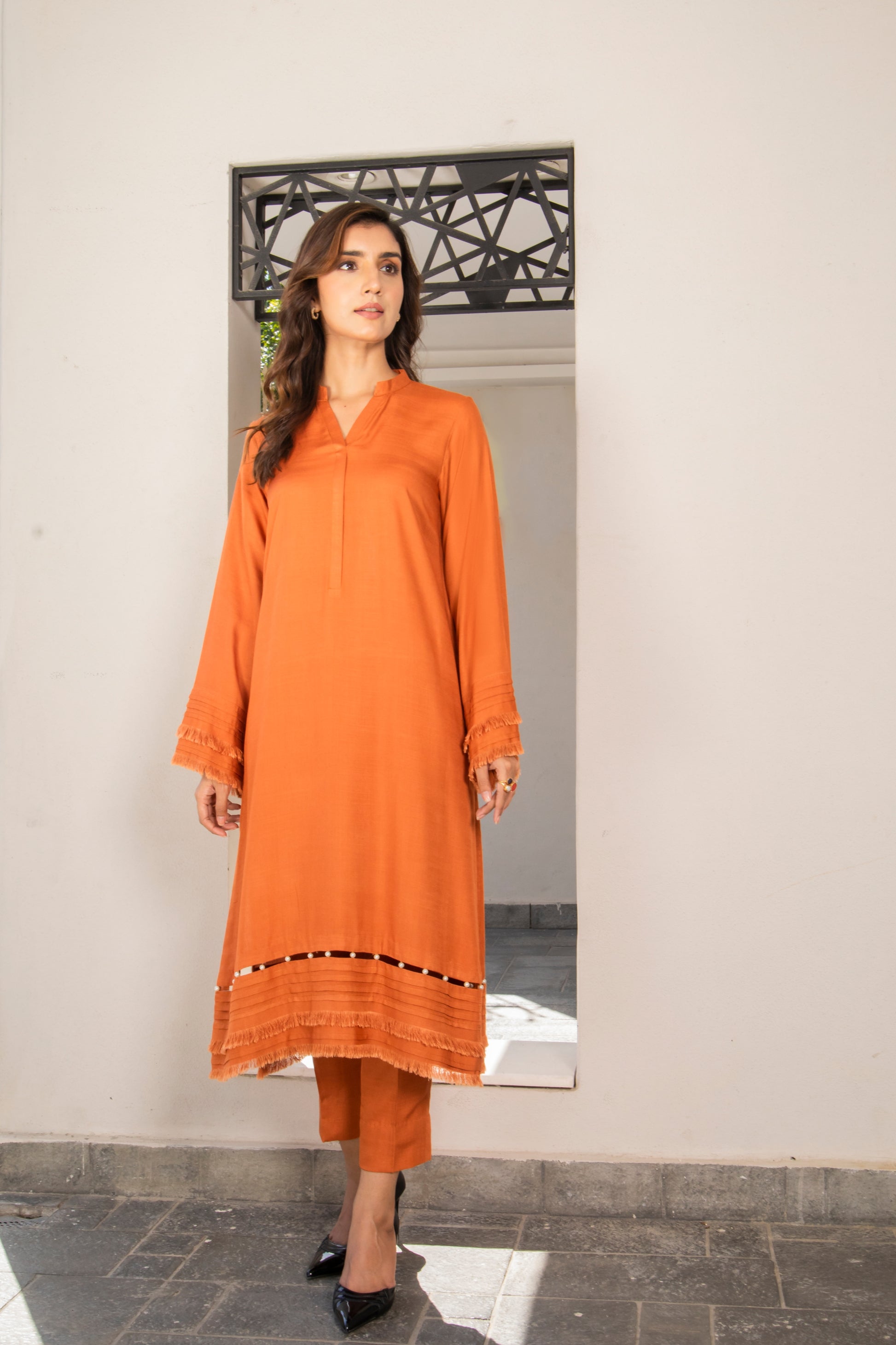 A bold Orange outfit with pearls, pleats and fringe details along the hemline is perfect for an evening dinner.